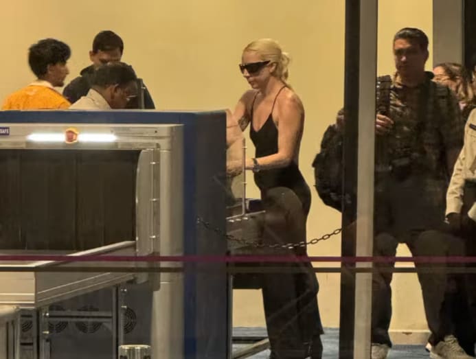 Dressed in a black form-fitting outfit and towering platforms, Gaga navigated the security check without an entourage.