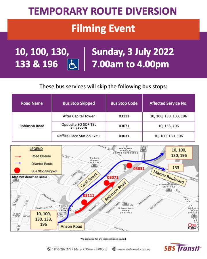 SBS Transit and Tower Transit both announced that their buses would be skipping some stops there for a “filming event” from 7am to 4pm on Jul 3.