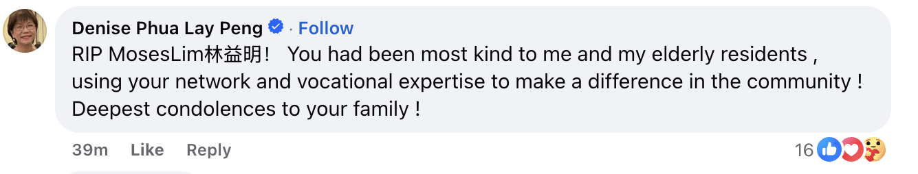 In a comment on a Facebook post by CNA, Singapore MP Denise Phua wrote that Lim "had been most kind to [her] and [her] elderly residents" and used his "network and vocational expertise to make a difference in the community".