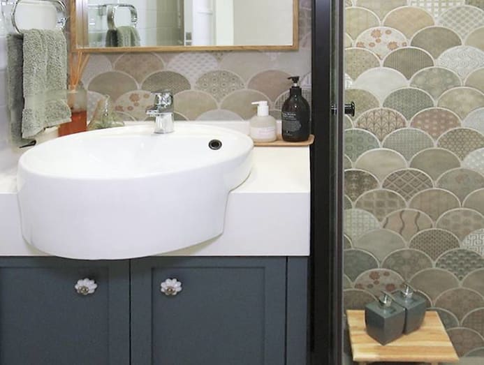 The common bathroom draws heavily from both Japanese and Peranakan aesthetics, thanks to earth-toned multi-patterned fish-scale wall tiles, and honeycomb-shaped floor tiles in muted grey. A deep blue under-sink cabinet with vintage crackle-glazed porcelain knobs adds a charming finishing touch.