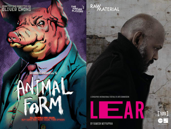 Comedian Hossan Leong’s Hossan-AH! In The High Arts and local theatre company The Finger Player’s adaptation of George Orwell’s Animal Farm. (Photos: Arts House Limited)