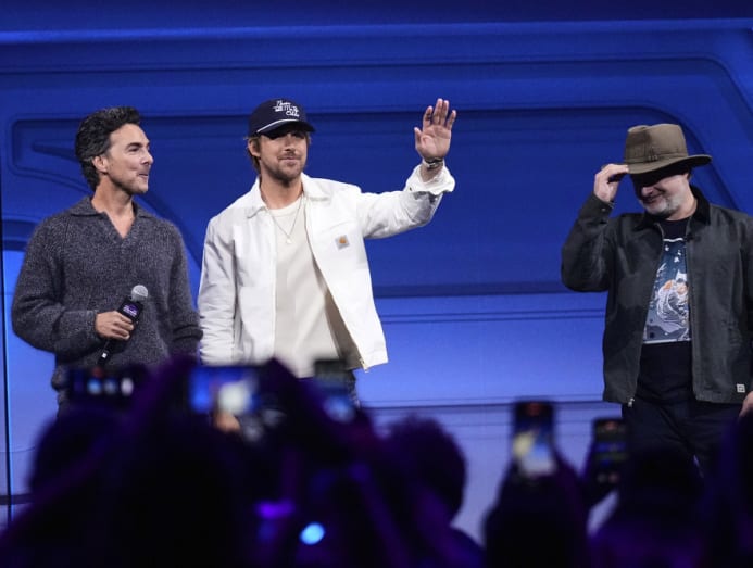 Actor Ryan Gosling waves at audience members during a fan convention called the Star Wars Celebration in Chiba, near Tokyo, Friday, April 18, 2025. (AP Photo/Hiro Komae)