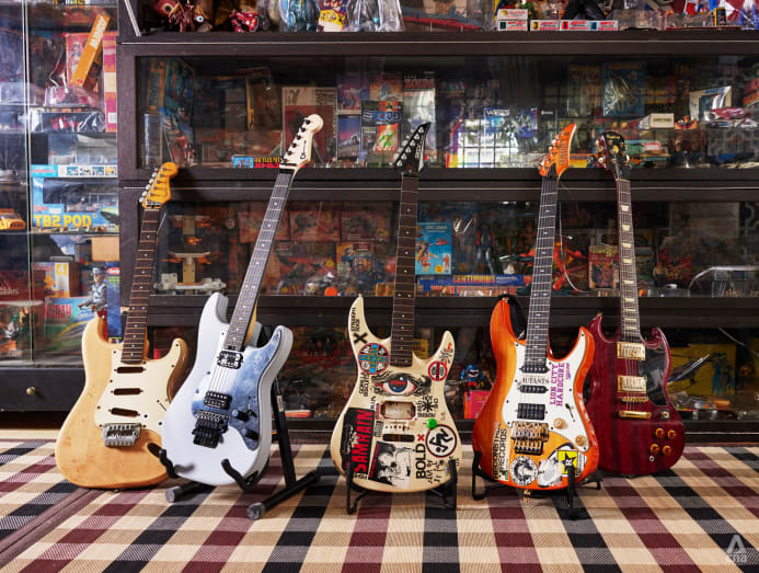 Hardcore punk legend Suhaimi Subandie at his house, posing with his guitar in front of one of his toy display cabinets. (Art direction: Jasper Loh; photo: Kelvin Chia/CNA)