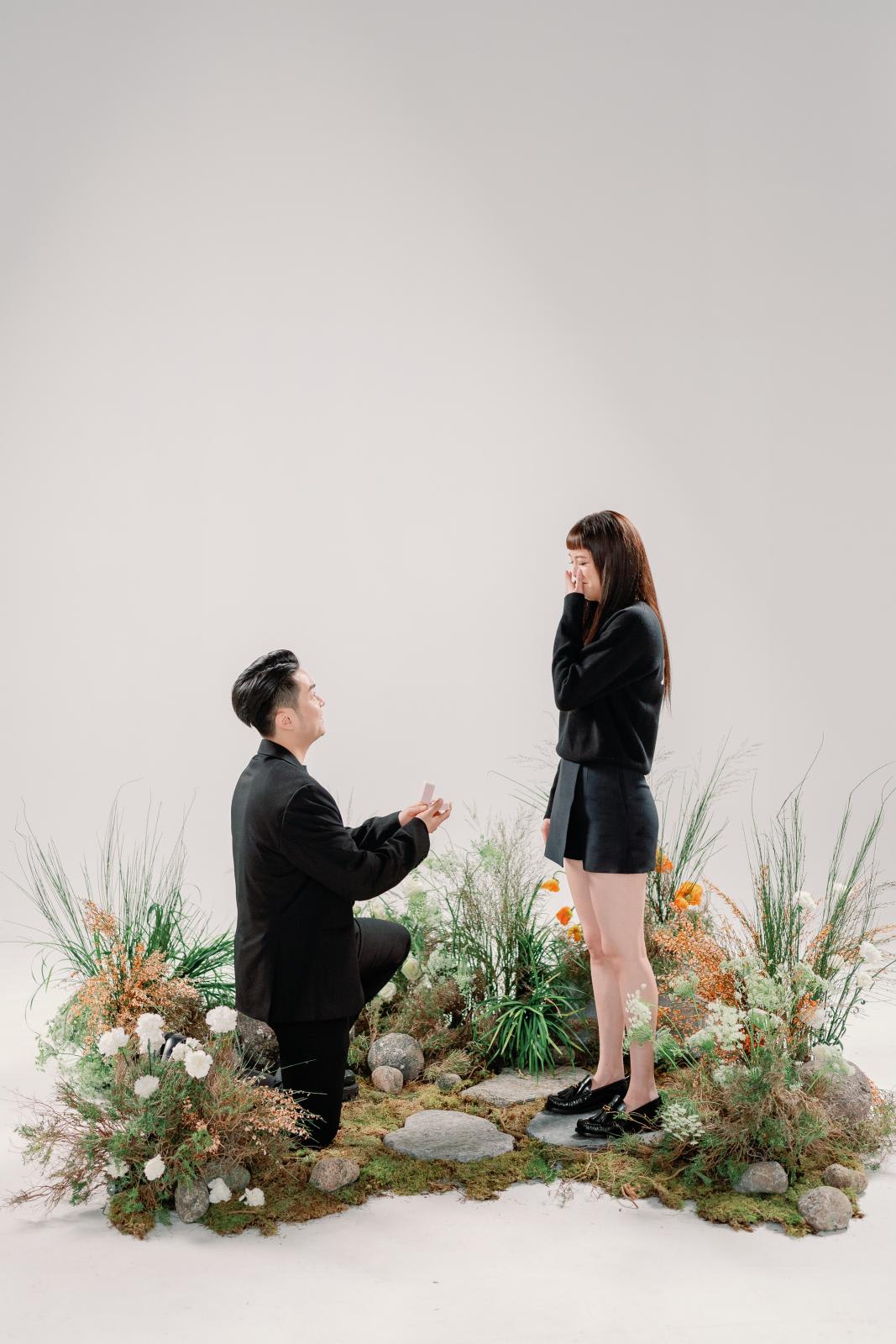 He asked a photographer friend to arrange a photo shoot in a studio on the pretence that it was for content creation. There, they had her enter a room where a photo montage of their time together played on a projector screen, and Wu appeared with a bouquet of flowers; meanwhile, without her noticing, friends and family filtered onto the mezzanine.