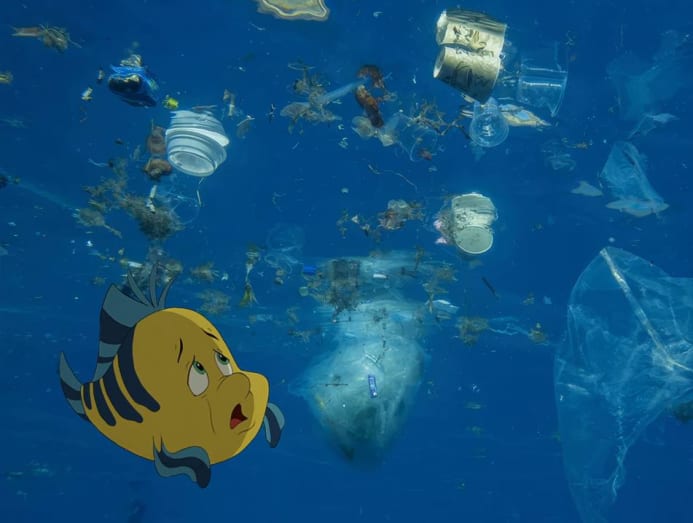 The five new pieces he created highlight such issues that he believes are important to showcase to children. There is, for instance, a piece with Flounder from The Little Mermaid floundering amid trash in the ocean, and one featuring the toys from Toy Story buried in an overflowing landfill.