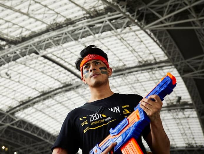 Battle zombies using Nerf guns in a survival game at the National Stadium