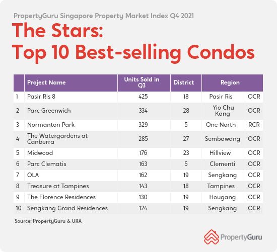 Three out of five districts that made the list had entries in the top 10 best-selling condos in Q3 2021. This includes Pasir Ris 8 and Treasure at Tampines in District 18, OLA, The Florence Residences, and Sengkang Grand Residences in District 19, and The Watergardens at Canberra in District 27.