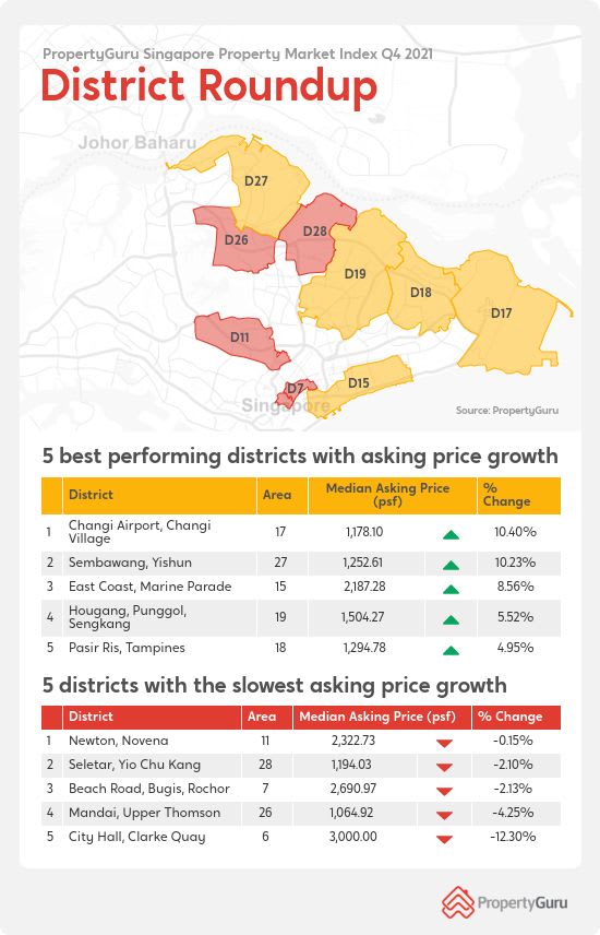 Although District 6 recorded the highest price decline of 12.3 per cent, the median asking price of S$3,000 psf is still considered very healthy. Similarly, Districts 7 and 11 in the CCR both have some of the highest asking prices in Singapore, and hence saw a slight downward adjustment this quarter.
