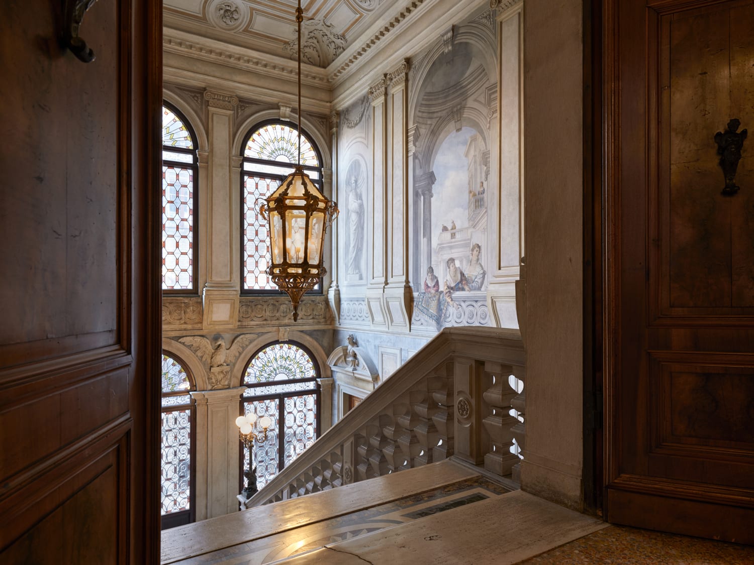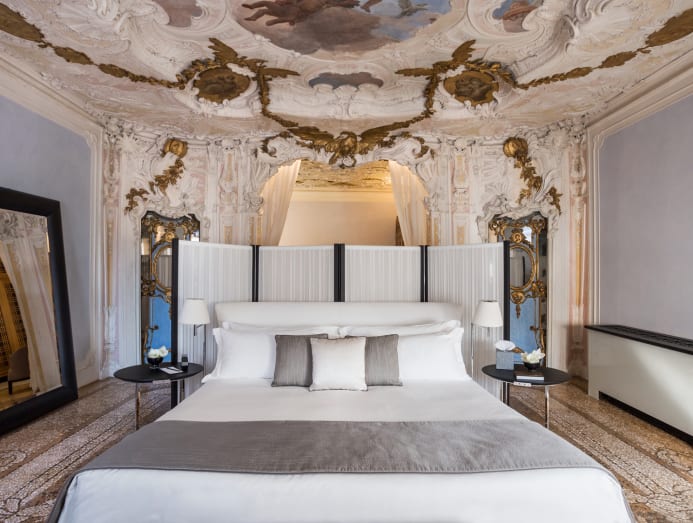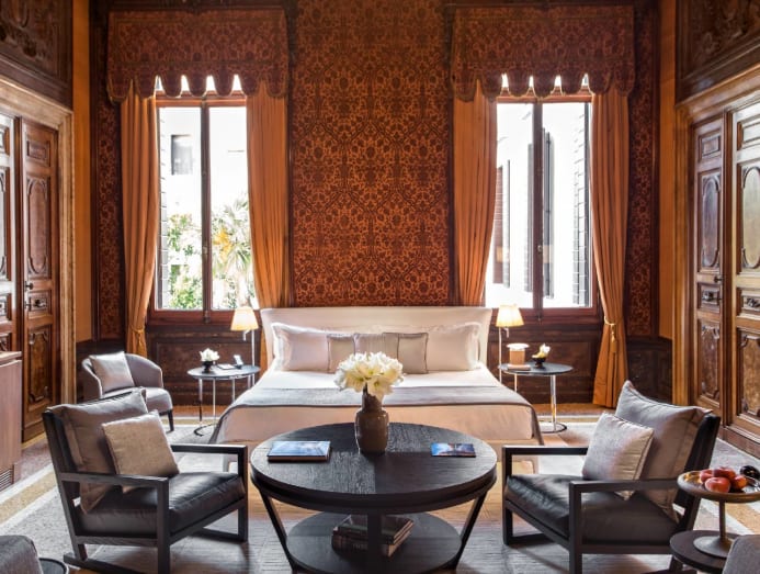 Guests are greeted with soaring ceilings adorned with gilded mouldings, and grand chandeliers made of Murano glass, while many rooms boast historic silk wall coverings, traditional terrazzo flooring, and intricately carved fireplaces.