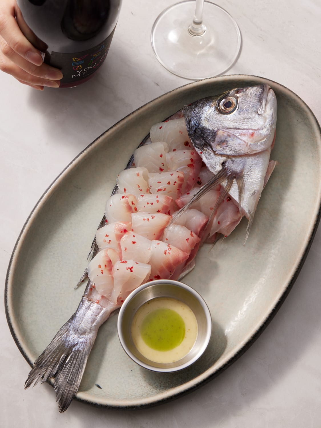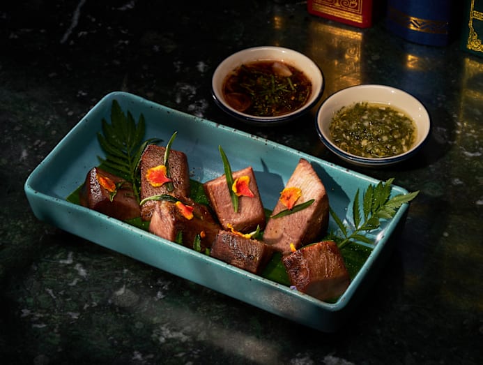 Seafood is the main act. The star of the show is the dry-aged seabream sashimi, a social-media sensation that deserves its viral fame. Served whole and slicked with yuzu kosho, the fish is at once delicate and punchy, its subtle umami balanced by citrus brightness.