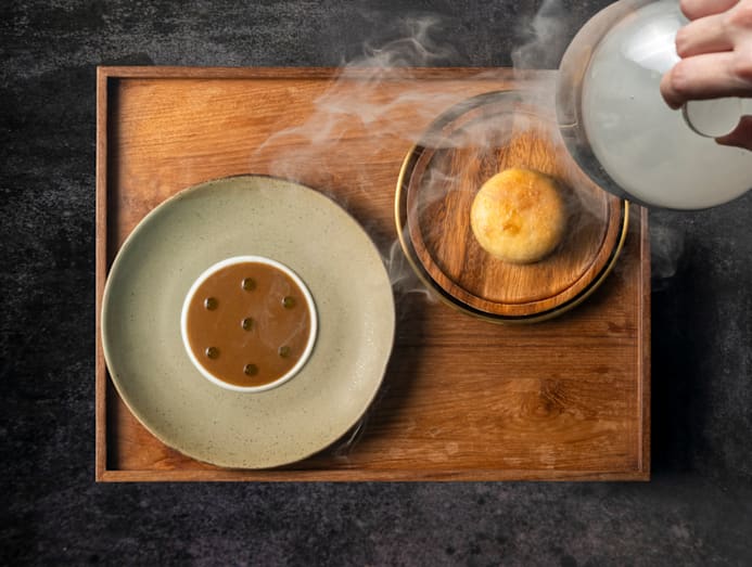 Similarly stellar is the raw offering, which involves blue swimmer crab sourced from Ranong. Fresh and sweet crab meat is delicately wrapped in two types of fresh mango. A rich smoked curry involves Phetburi lamb and Thai melon chutney slow cooked for six hours and stuffed inside a roti baka bun which is then grilled to perfection. But the meal highlight is arguably a stunning soup featuring Charolais beef in a rich, coconut broth elevated by palm heart and pickled shallots.