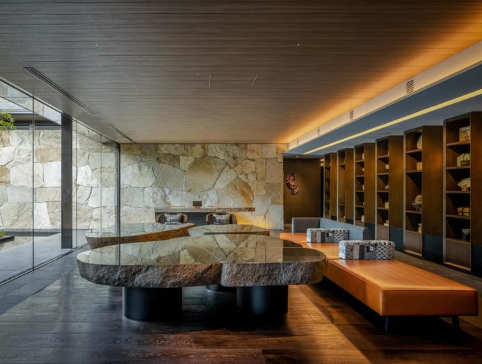 Yukio Design Studio (HYDS) conceived the interior design, with elegiac touches such as the large coffee tables in the lobby with roughhewn bases and glossy surfaces that turn fiery red and orange in autumn, and green in spring to reflect the garden’s foliage.