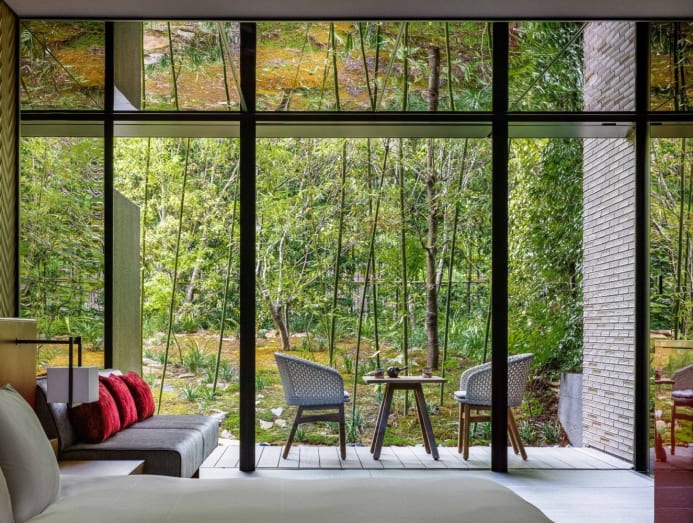 The guestrooms are no less welcoming. Ranging from 40 to 53 square metres – generous for Japanese hotel room standards – some extend to the outside with balconies overlooking Nijo Castle’s grounds. “The interior decor celebrates Japanese heritage in a subtle manner, with vermillion-accented lacquer furniture, textured walls and minimalist spaces,” said Kusumadi. Skilled naguri artisans created the touches of intricate woodwork.