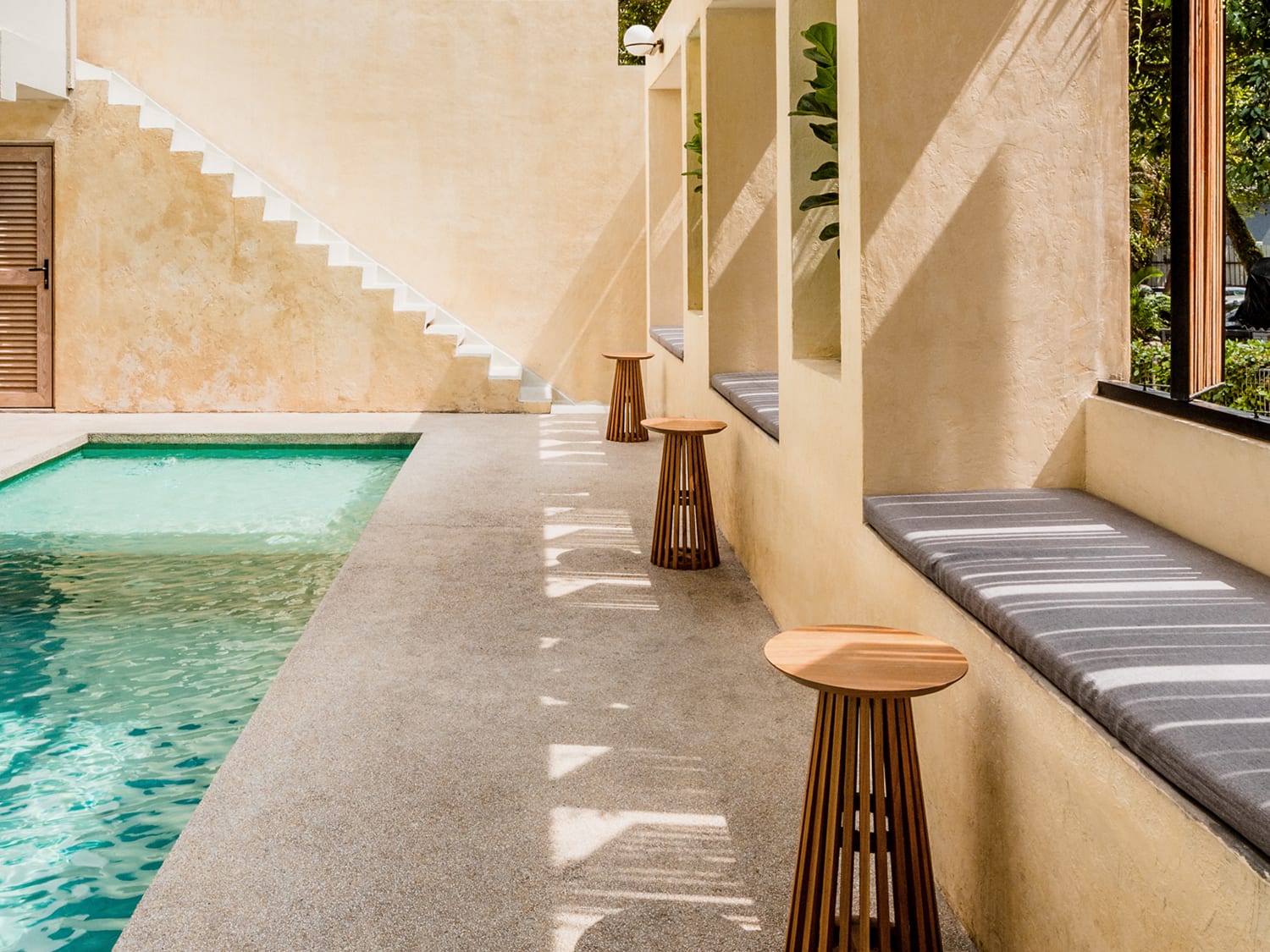 It’s as relaxed and offbeat as its owners, the duo behind design and branding collective Studio Kanta, Adrien Kent and Suek Mei Chai, and a culmination of their personalities. A bit whimsical and wacky, revel in the David Hockey-esque colour palette, a scallop-edged bar and cheeky details.