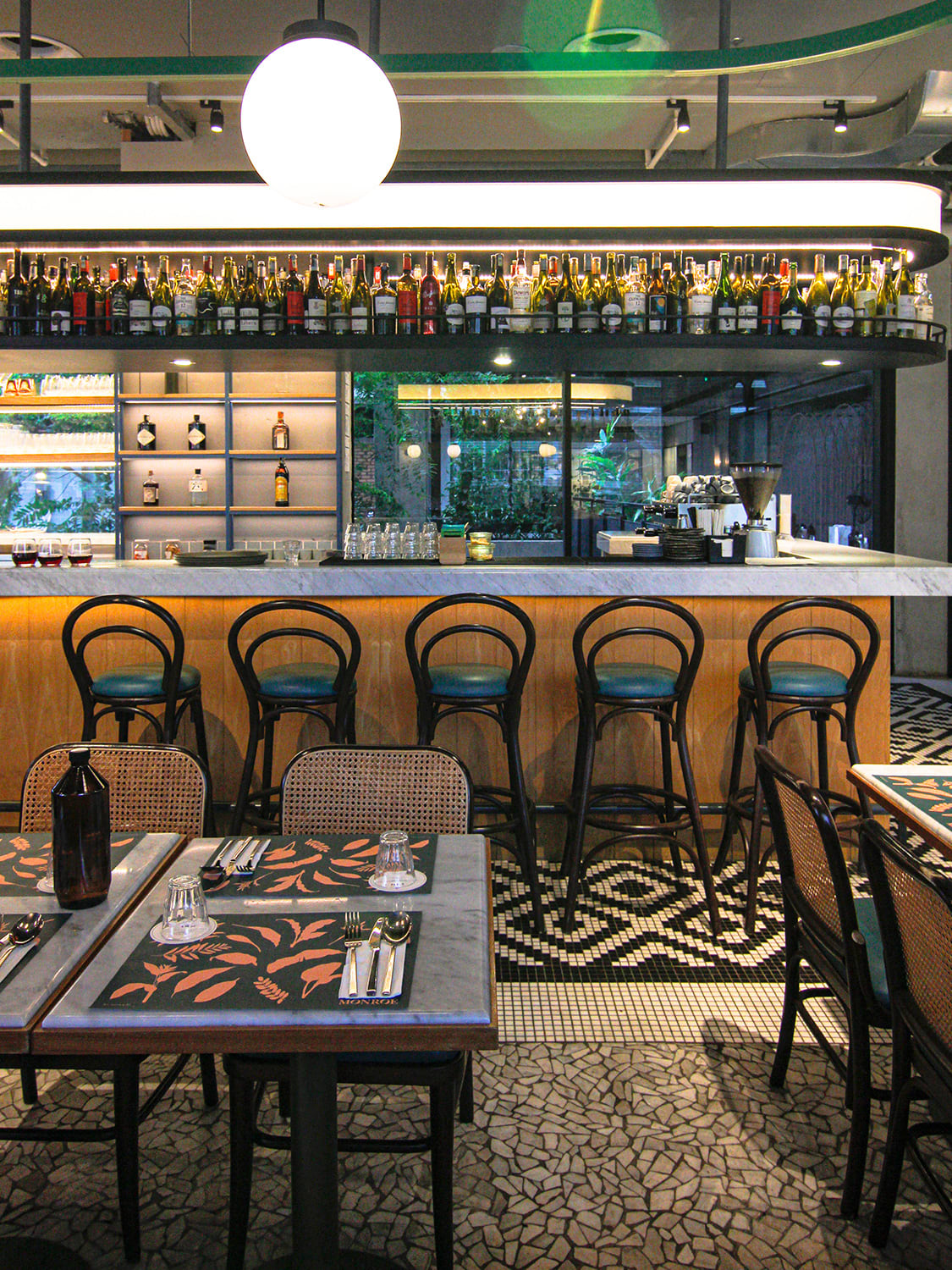 Designed by Singapore firm Wynk Collaborative, the State-side diner references are evident from the long bars, curved booths and neon sign. Local context is seamlessly woven in from the colonial-style geometric mosaic flooring, wicker-backed chairs and bentwood counter seats with gleaming marble and brought to the present day with hipster industrial vibes via the eggshell tiled walls and exposed concrete ceilings.