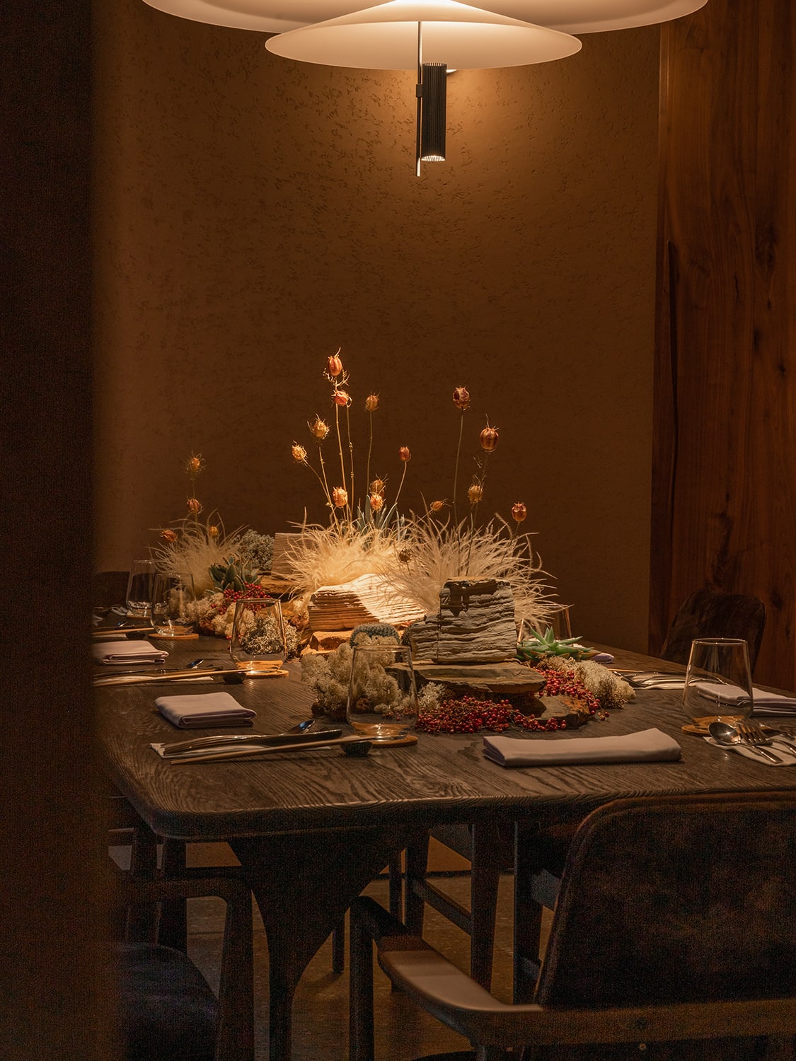 The skill lent itself well to this bright, restful restaurant within a lush greenery landscape with plenty of outdoor seating and a cosy outdoor bar. Wood detailing and exposed bricks make a pleasing background populated by neutral-hued furniture in tactile fabrics, rattan chairs and sculptural wooden lighting