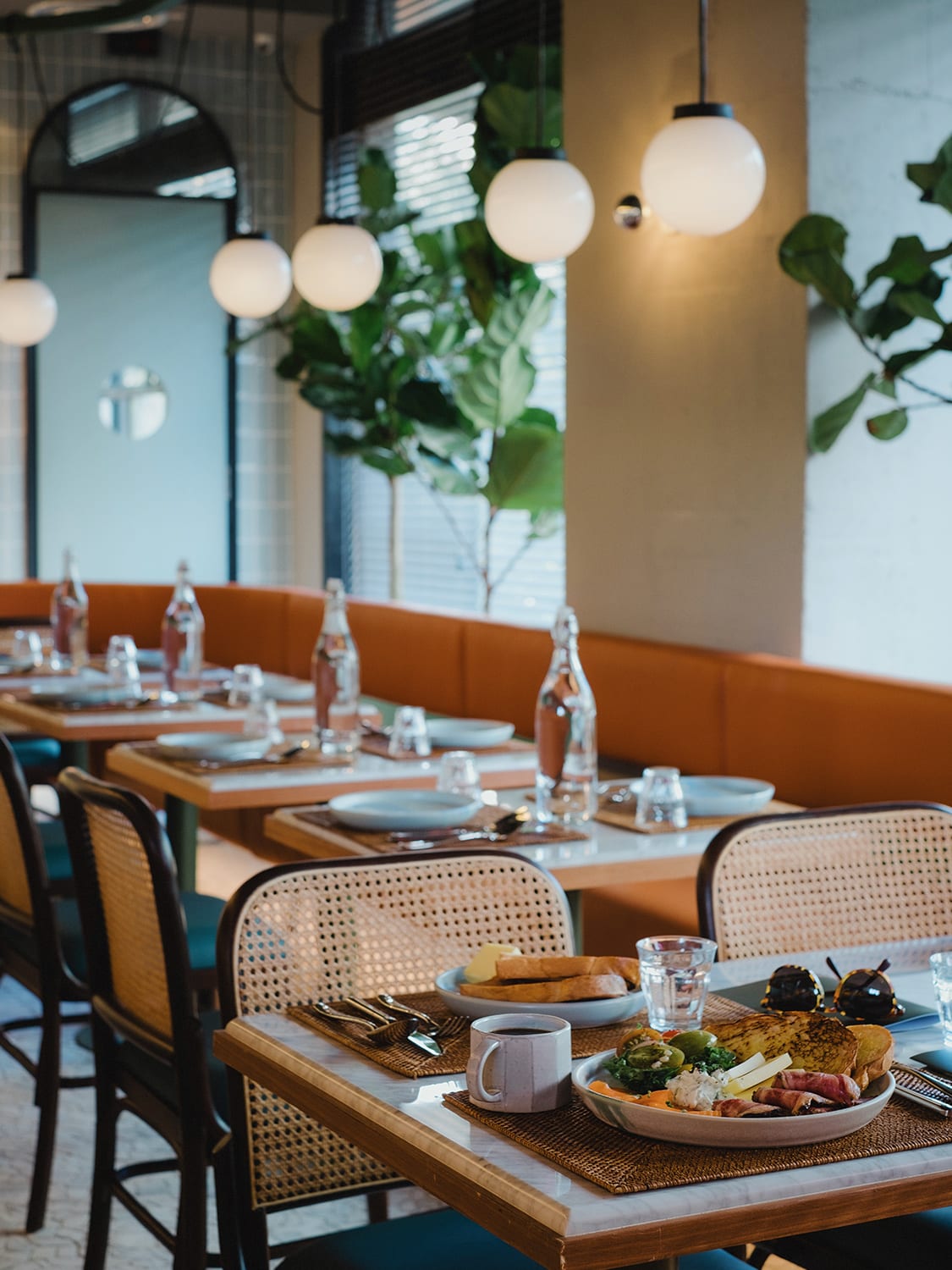 A subtle creamy stucco finish adorns most walls, accented by pale wood trimming, and is complemented by black metal, warm lighting, a grey mosaic tiled floor and strategically placed plants. Offering an expanded and elevated menu from VCR’s available cafe offerings, this space is the ideal backdrop for lingering over this more refined menu.