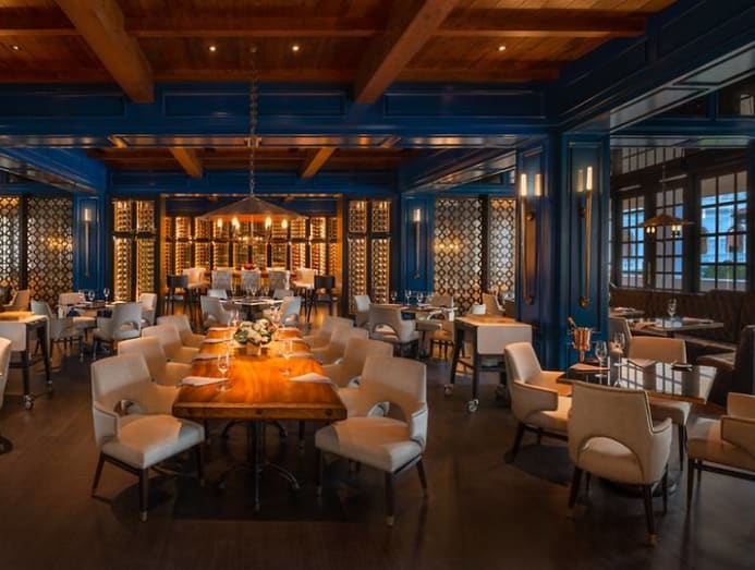 The restaurant interior sets the mood: Timber rafters, Prussian blue columns with French mouldings, leather banquettes. It’s enough to transport one to a French provincial manor house.
