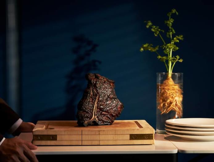 The restaurant sources its beef from Australia, Ireland and Japan, ordering full carcasses so that the entire animal can be used. In Australia, Lefebvre works with Rangers Valley, a highly rated producer that prides itself on its genetically superior stock, procuring full bone-in loin Wagyu crossbreed WX MBS7+.