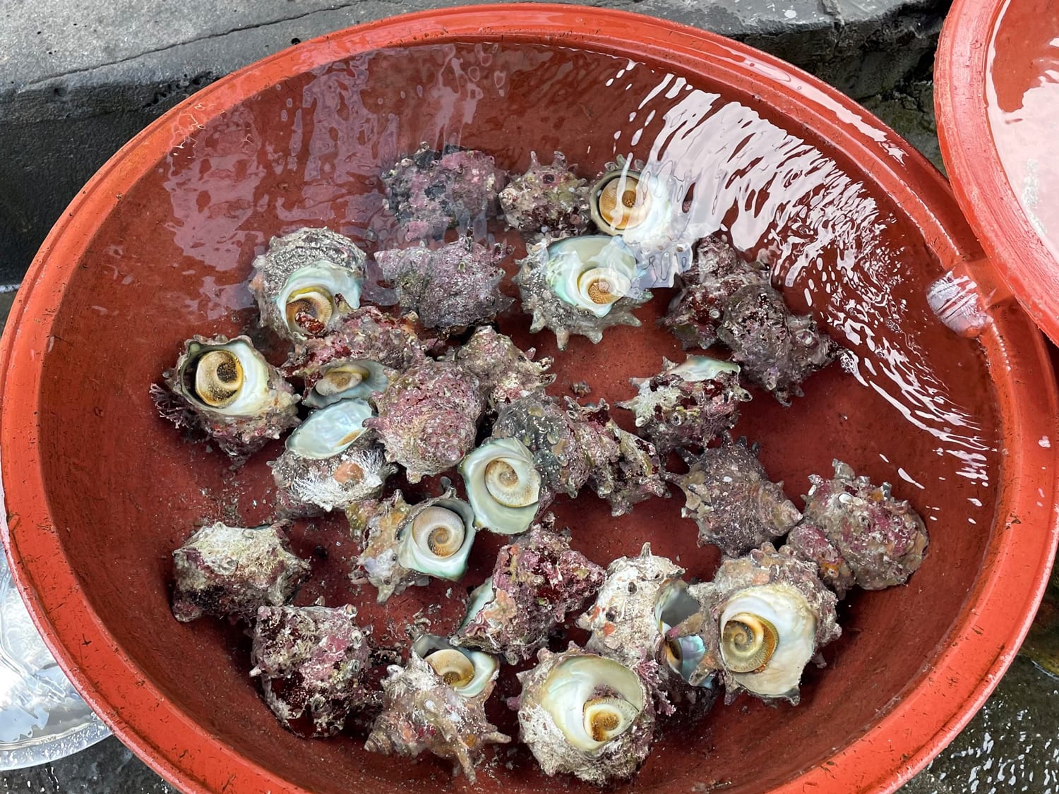 Eventually, we came to the edge of a small bay ringed with a low sea wall that kept the waters calm. There were already a number of day-trippers and families, some gently bobbing in the sea and others taking selfies with their camera sticks. Ko was already in the water, one hand gripping a conical net hitched to a yellow float that kept the net and its contents afloat.