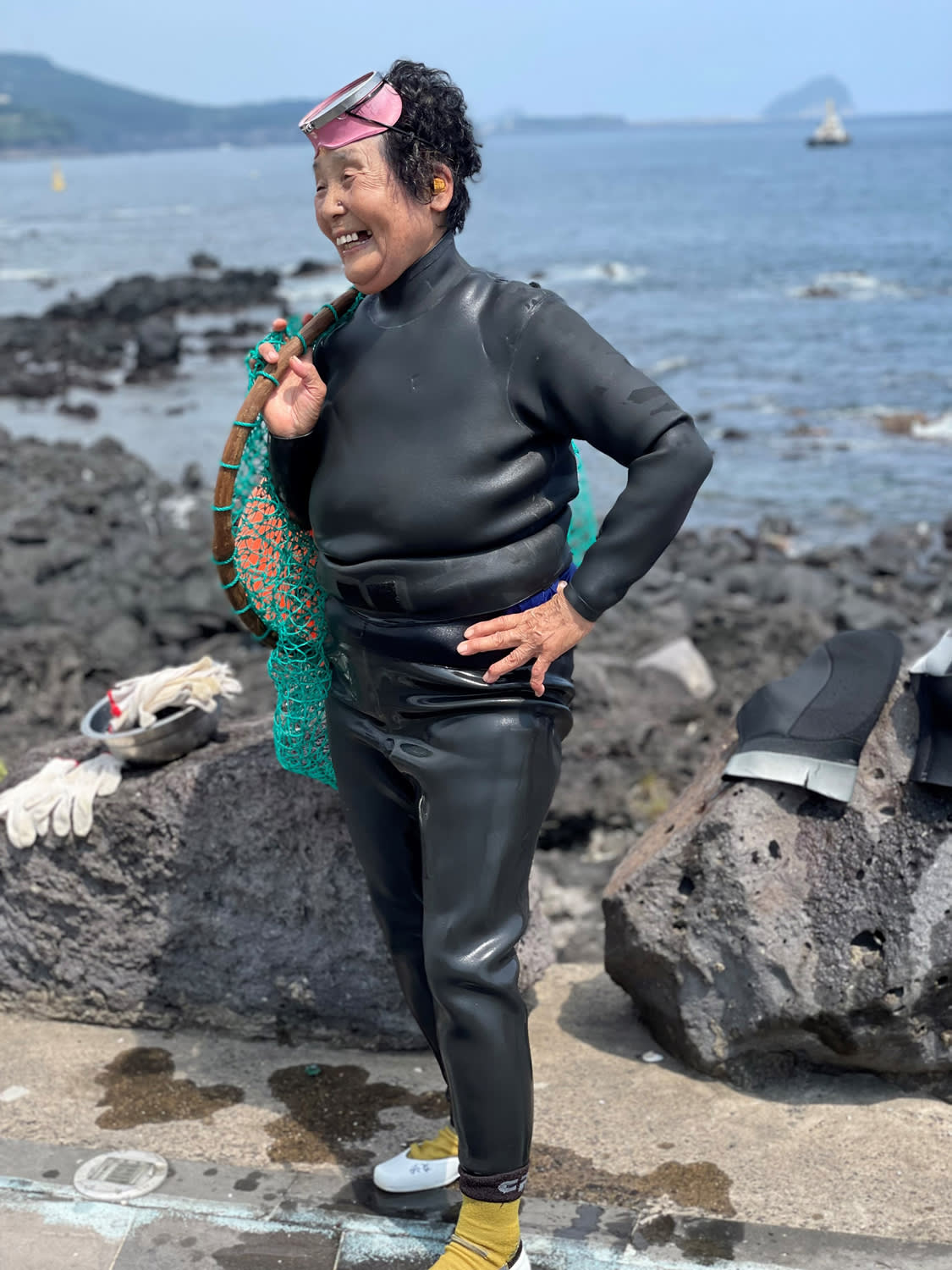 At the local Beophwan Haenyeo Experience Center, a few minutes drive from the hotel, we were collected by Mija Ko, a petite, sprightly, bright-eyed woman who, at 19, began working as a haenyeo to help raise her family. That was 50 years ago. “I was born and raised in the ocean,” she said as she checked my wetsuit. I couldn’t help but marvel at her smooth snowy-white skin. She had no pores. It was like looking at a dolphin. “My mother-in-law was a haenyeo, but we’re the only ones in our family.”