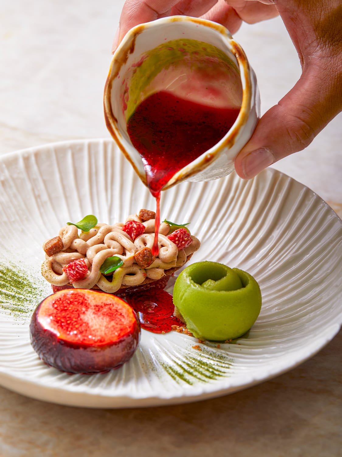 There, dishes like wild blueberries with Izarra, sheep bush, pastis croutons and sprouts of tagete may well have you asking for an explanation, but creations like