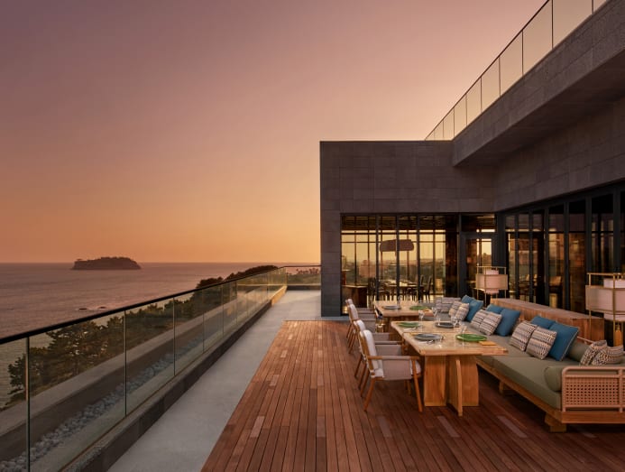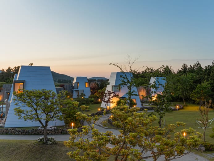 These rocks inspired WATG for the architecture of JW Marriott Jeju Resort & Spa. The 27,000 sq m, 89-key building hugs the cliffs of Jeju Island’s southern coast in Seogwipo. Spread across several blocks, guests can weave outdoors and into Bangkok-based designer Bill Bensley’s yellow-washed interiors (the colour was drawn from the springtime canola fields that so besotted Bensley). Grey, black and white tones evoke the island’s volcanic landscapes, and along the corridors, metal flying fish pay homage to Jeju Island’s fishing traditions.