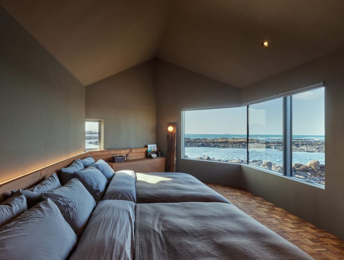 Naturally, Jeju’s vast, varied and enigmatic landscapes provide the perfect scenery for picture windows. The island has no lack of design-savvy accommodations that take advantage of this. One of them is NYEOK, designed by Korean architecture firm Z Lab. On the face of the angular building, bands of windows frame the rock-lined coast, with the occasional seabird and rolling white crest of waves on turquoise waters that segue into baby blue skies.