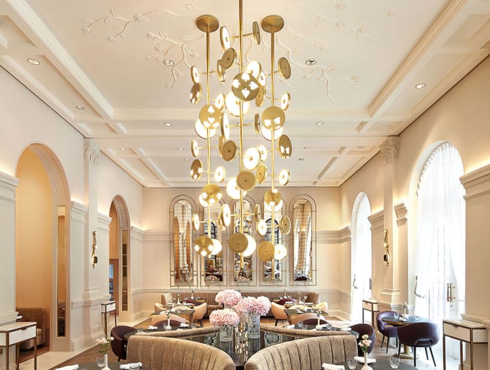 Alexandra Champalimaud daubed the light-filled space in a pastel palette: Blush, mauve and grey, enlivened by plum and metallic accents. Bas reliefs on the ceiling display peony motifs that radiate from the restaurant’s centrepiece, an enormous brass chandelier composed of tiers of discs with laser-cut spades. No starched white linens here: The ambience is meant to be unfussy and inviting.