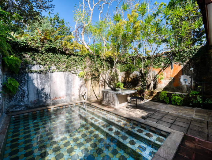 Back inside, the main bedroom is a study in minimalism. A low concrete bench runs in a L-shape along two walls, acting as a base for low-slung white cabinets and a small double mattress (don’t fret, it’s new), and ledges for decorative statues. A little annex holds a desk which, through the tall glass windows, overlooks a bijou enclosed courtyard with a decorative pool and doors that open out to the garden beyond.