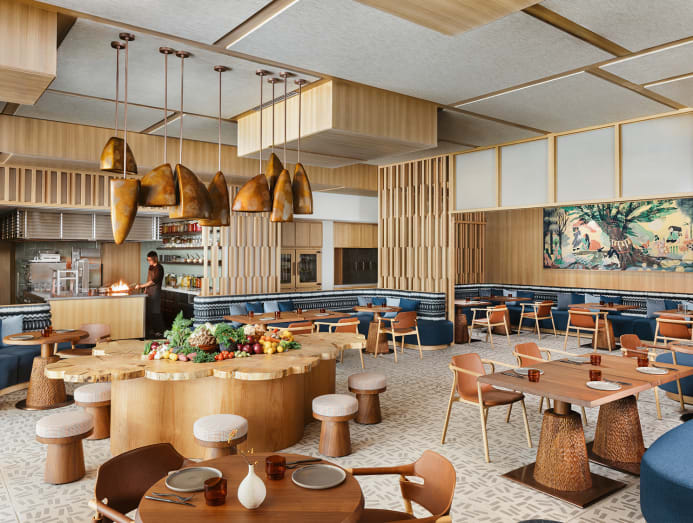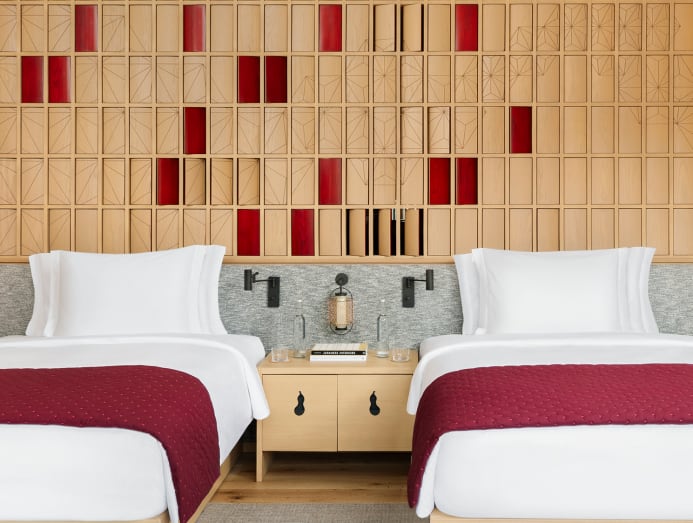The 81 rooms and suites, ranging from 42 sq m to 238 sq m, are the perfect starting point for a wellness reset. Wall scones inspired by traditional hand-carved wooden plates, bedside lamps wrapped in metal netting like fishermen’s baskets, Sakan plasterwork and a screen that can be flipped between the bed and bathroom marry craft and storytelling.