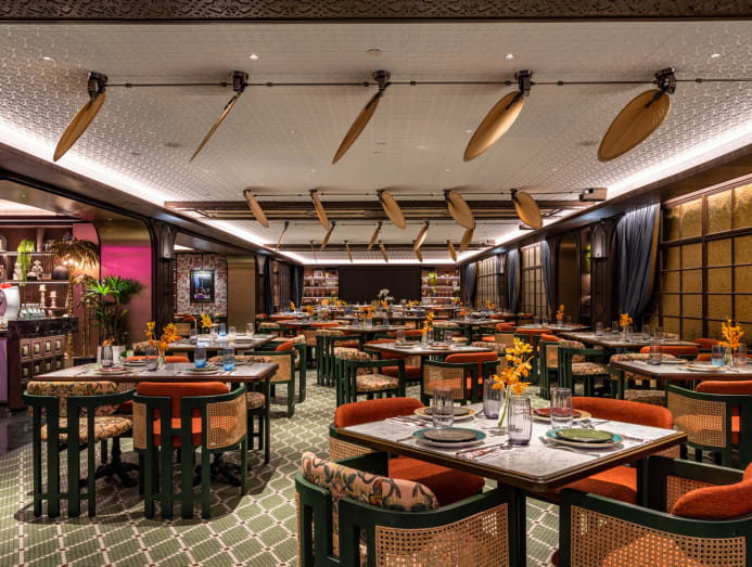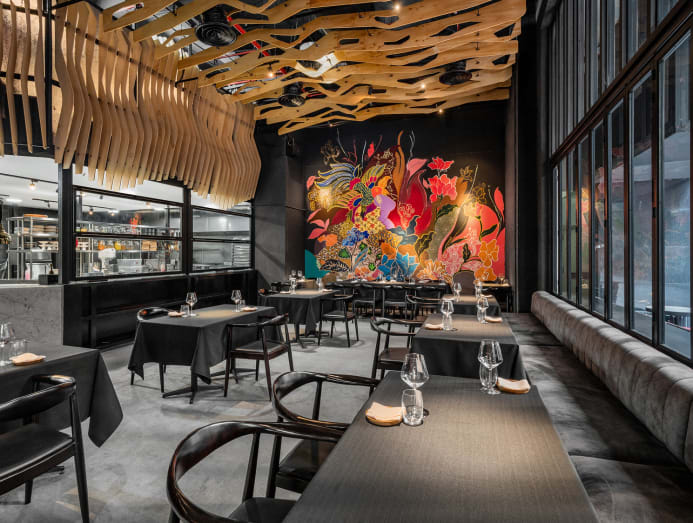 The restaurant itself is an exuberant space designed with vivid colours and layers of textures with a centrepiece bar and stepped seating area. Artistic murals provide a chic backdrop, and a semi-outdoor section is lovely to dine in when the weather is right.