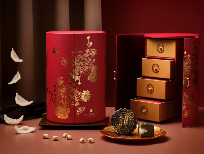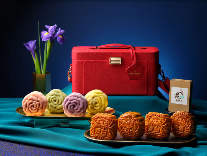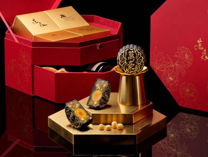 To level up the traditional baked mooncake experience, try the golden black truffle mooncakes with dry-aged Parma ham, pistachios and single yolk ($98 for a box of four) from this stalwart hotel. Each is encased in a black charcoal skin and brushed with gold dust for a sleek, modern look. If looking to impress and/or splurge, go for the package that comes with a 375ml bottle of Taittinger Brut Reserve (S$248).