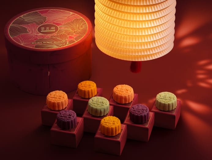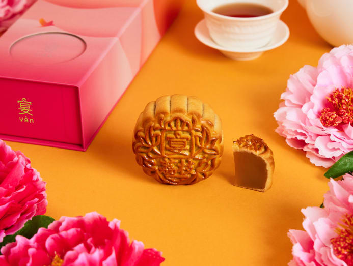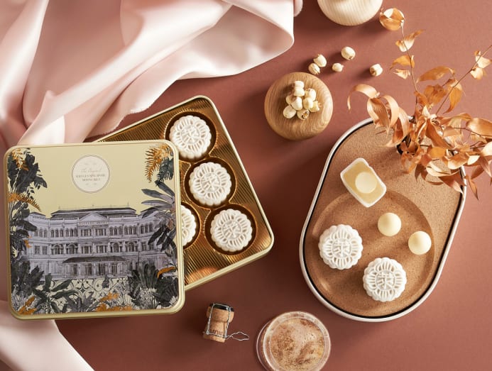 It’s impossible to talk about mooncakes and not mention Raffles Hotel Singapore. For many, it is yardstick and nostalgia rolled into one, especially when it comes to its beloved champagne truffle snow skin mooncakes (S$99 for a box of eight). Two new flavours join the line-up this year: Sakura and raspberry truffle, and yam and coconut rum truffle. The former is inspired by the popular Sakura Sling cocktail at Long Bar, with its fresh and fruity pink notes, while the latter is a contemporary take on the traditional Teochew mooncake. Both are priced at S$97 for a box of eight.