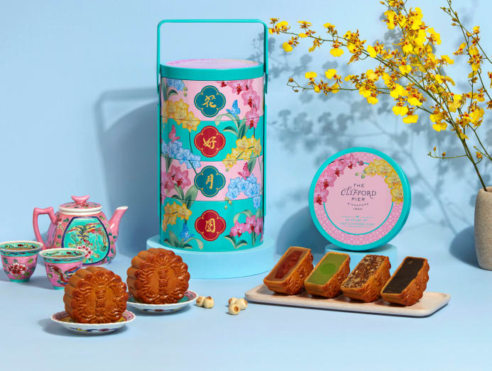 To celebrate Clifford Pier’s 90th anniversary, its namesake restaurant at Fullerton Hotel Singapore has released a Mooncake Tingkat (S$108). The design features Peranakan-style Singaporean motifs like orchids and butterflies alongside Chinese calligraphy-style characters. Each carrier holds four baked mooncakes that reflect Singapore’s diverse hawker cuisine: Mixed nuts with satay peanut sauce, salted lotus with hae bee hiam, assam lotus with mango, and pandan coconut with chendol.