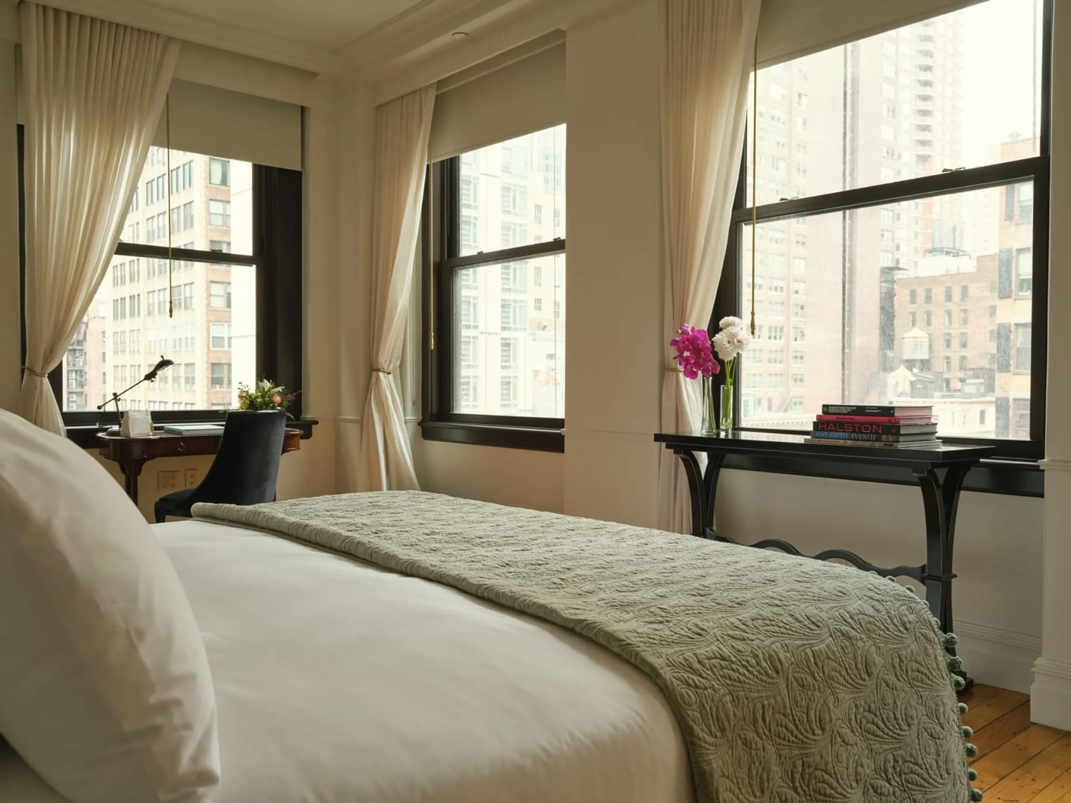 The new hotel is an offshoot of the Ned in the City of London, housed in Edwin Lutyens’ impressive former Midland Bank headquarters and managed by the Soho House group. While the Ned’s next NY venture (a hotel due to open in 2024 in the former American Stock Exchange in Manhattan’s Financial District) points to a symmetry with their London birthplace, this outpost looks very different. It’s situated on Broadway, a block south of the Ace Hotel, in an imposing corner building that looks like a piece of Paris extruded an extra 10 storeys upwards.