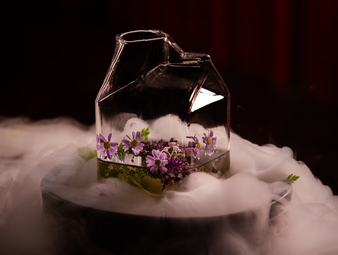 They’re also as fun to look at as they are to drink. The bar team has gone all-out on presentation: Pretty Please arrives in a swirl of dry ice mist and flowers, while Curious Chameleon is poured from a glass teapot into a champagne flute, the drink growing pinker the longer it macerates with the raspberry hibiscus sorbet in the pot.
