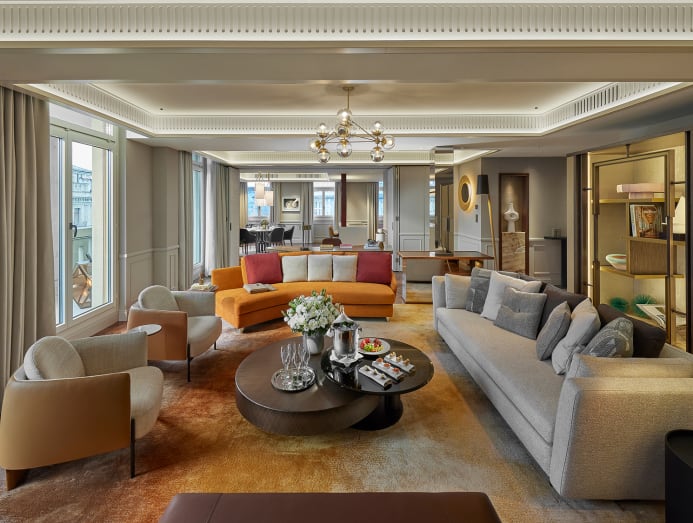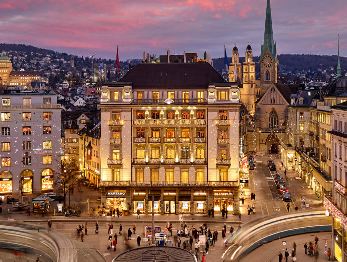 Located right across from the original headquarters of UBS and Credit Suisse, the hotel is only a stone's throw away from the luxury flagship stores lining Bahnhofstrasse and an easy stroll to Lake Zurich. Housed in a building dating back to 1838 that was home to the iconic Baur en Ville hotel — the first grand hotel in Zurich — it was wise for French designer Tristan Auer to retain some of its storied flavour.