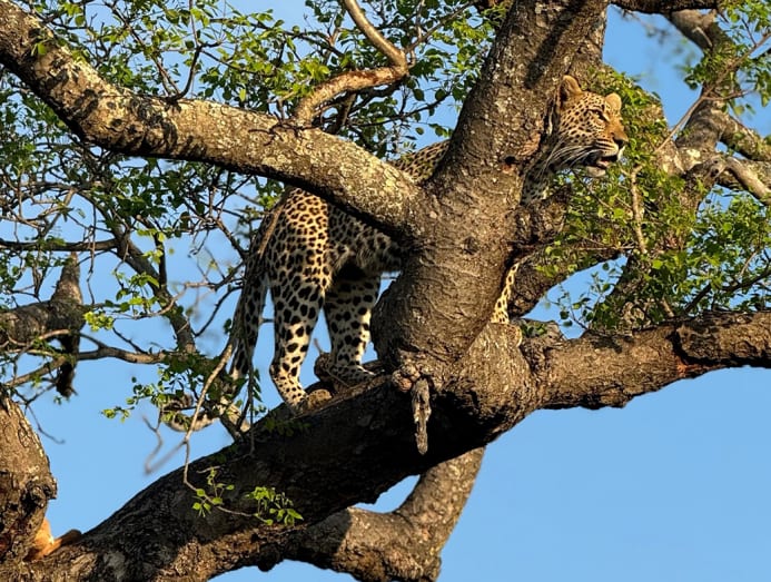 You could tell the leopard was irritated because with the impala still firmly wedged in her jaw, she scrambled up a tamboti tree to get away from the scrum of snap-happy humans below. As physical feats go, this was way up there with Wonder Woman bursting into the law court at the start of Justice League.