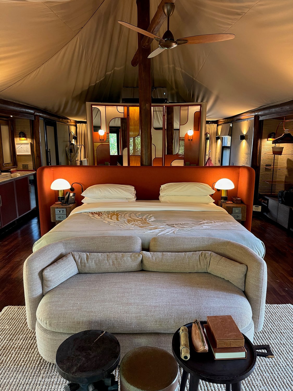 This past November, the resort reopened after extensive rebuilding and renovations which included a new gym, spa and swimming pool. The tents are huge, a spacious outdoor deck with outdoor bathroom courtyard adding 40 s qm to the 60 s qm interiors which are dressed with timber floors, local Shangaan embroidery on ceiling panels, and dividing walls made of large river stones. If they’d ever shown King T’Challa’s bedroom in Black Panther, it probably would’ve looked just like an Ngala tent, it’s that posh.