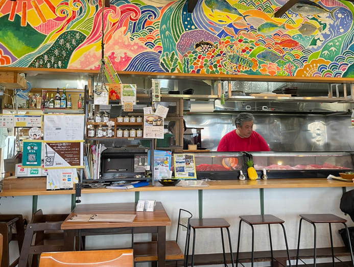 The introduction of Spam by the US military is now a staple in the local diet. The pork and egg onigiri are said to be an Okinawan invention and the chain Potama (short for pork, tamago onigiri) does a superb version of it.
