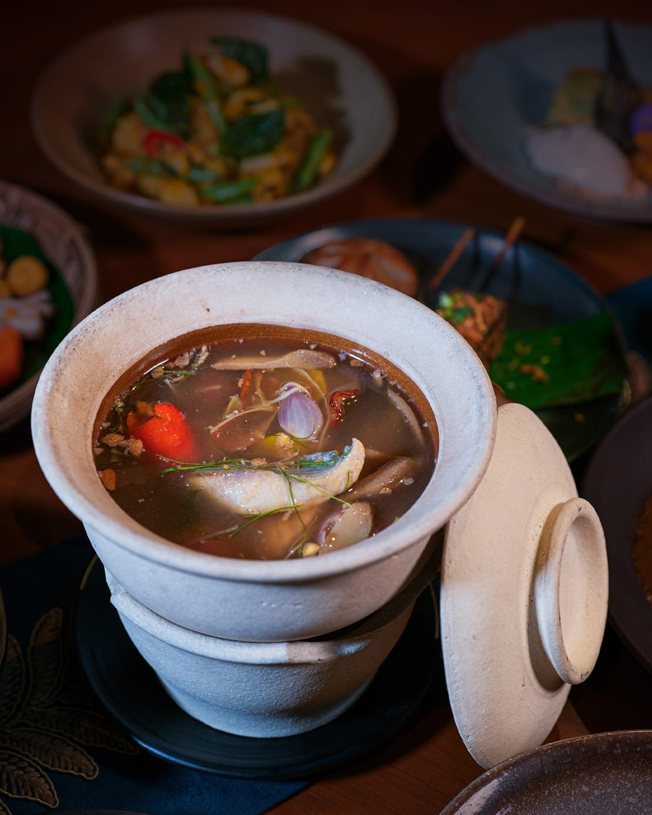 In the intimate dining room, the eight-course tasting menu begins with a four-part amuse-bouche before building towards heartier dishes: crab tomalley baked rice in a claypot with Beka squid, and cold squid udon in tom khem broth.
