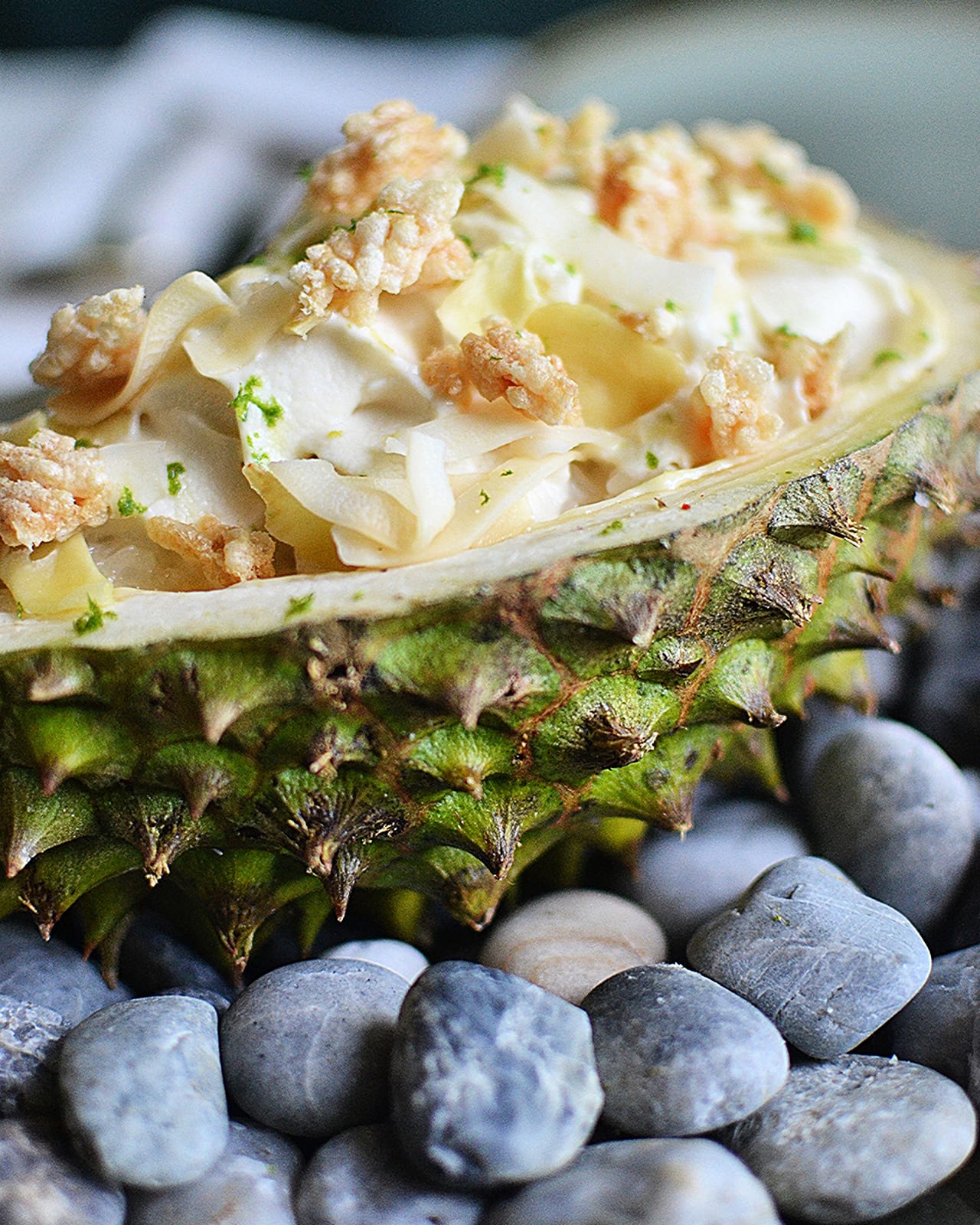 During my meal in June 2025, Doucakis had just introduced a seasonal dessert – Monthrong durian mousse – and gamely ducked into the kitchen to whip one up. What a memorable combination this was, of moist coconut sticky rice, crunchy durian chips and crispy rice atop airy durian mousse, served in a spiky durian shell for a bowl.