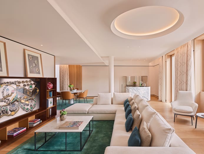 For the luxury jewellery brand, this isn’t just a hotel; it’s a homecoming to their birthplace, Rome. So it comes as no surprise that they’ve pulled out all the stops when creating their flagship property. First, the location: It’s right on Piazza Augusto Imperatore and set inside a historic rationalist-style building overlooking Caesar Augustus tomb.