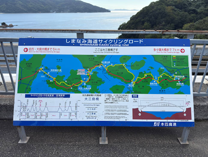 The route crosses the Seto Inland Sea, linking six islands, namely Mukaishima, Innoshima, Ikuchijima, Omishima, Hakatajima, and Oshima, offering panoramic views of the sea and the islands.