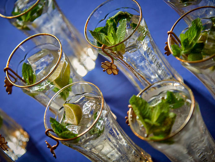 First, you start with a chilled highball glass (“You want it cold,” emphasised Dedieu, who recommended freezing your glass if possible.) Pack your glass with ice almost up to the brim, then pour in 40ml of St-Germain elderflower liqueur and add about eight mint leaves (“never slap or rub them,” said Dedieu, as this will bring out bitterness). Next, top with 60ml of sparkling wine (like prosecco) and 60ml of sparkling water. Finally, stir the drink to combine, then garnish with a mint sprig and lime wedge.