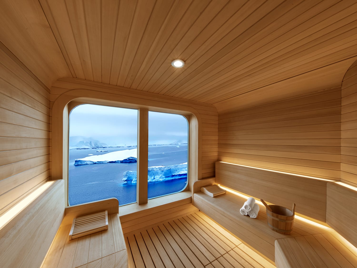 One day, after an afternoon kayaking in Port Charcot and communing with Orca whales, Gentoo penguins and Antarctic terns, a passenger was defrosting in the Venture’s pine-panelled sauna which features a floor-to-ceiling glass window. The view of the glacial mountains, as you can imagine, was stunning. A movement below caught his eye. Two giant humpback whales breached the surface, lazily turning their white striated chests up to the sky before sinking back into the metallic blue water.