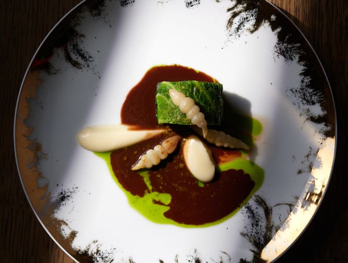 At their home in Denmark, guests can look forward to the Ocean Season experience until the end of May. After walking through the main door which is covered in a stunning mosaic of seafood shells, dishes include a cod head with a barbecued cod tongue, or a painstakingly deboned langoustine.
