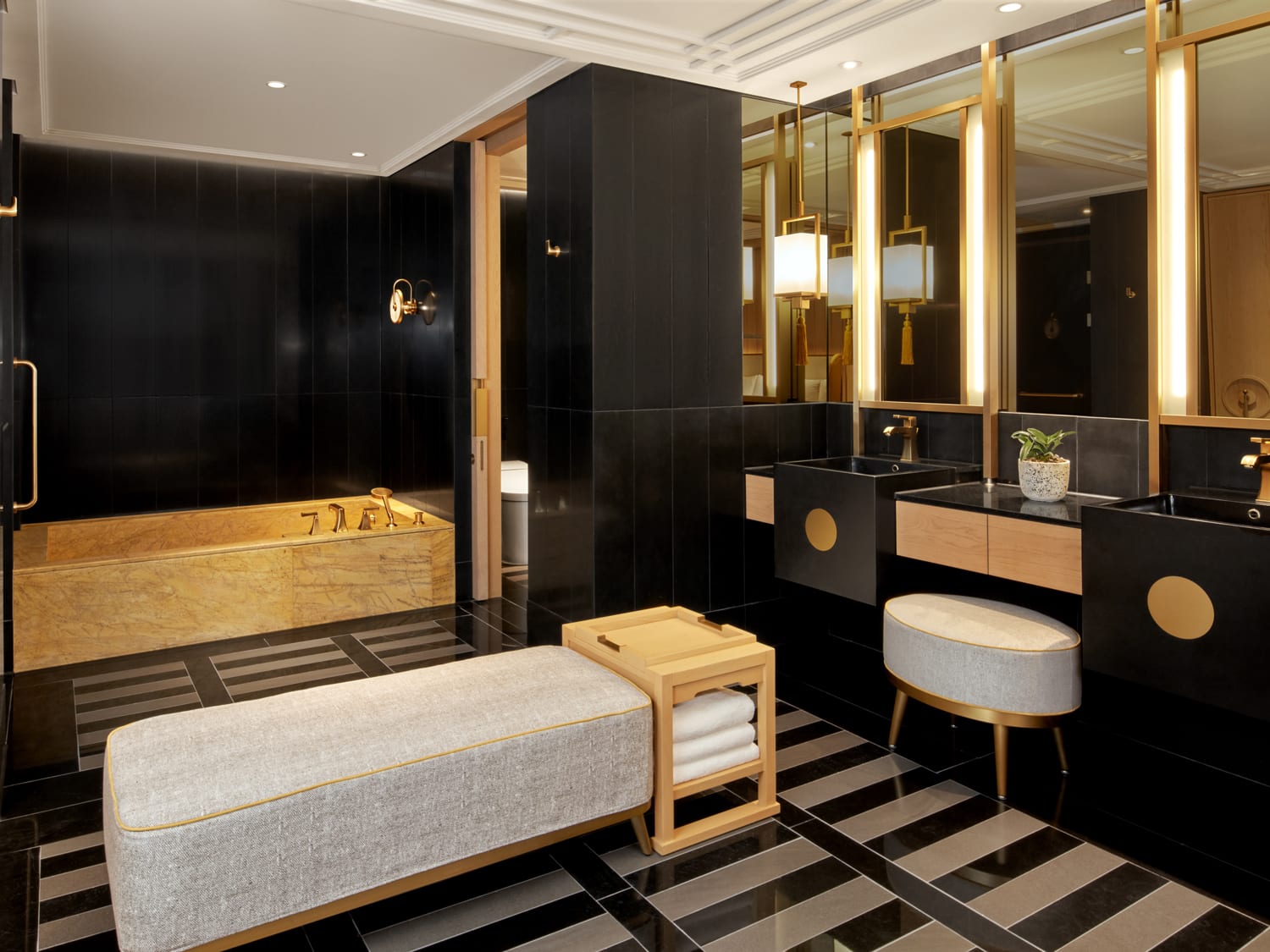 The interiors, meanwhile, are by Bill Bensley who has furnished the generously proportioned rooms and public spaces in a restrained mix of local stone, wood, glass and metal. There are light touches of traditional Korean design ‒ not too much, but just enough to remind you of where you are. The facades of imperial palaces frame the reception desk, for instance. The ceiling of the Flying Hog Bar evokes the image of a classic scholar’s hat, whilst little metal fish, fired like old wood carvings, decorate the skirting of the corridors of the guest rooms.