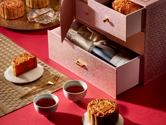 In collaboration with modern Chinese restaurant Madam Fan, JW Marriott has brought back its popular Pu’er Tea mooncakes (S$74 for a box of four), this time studded with chia seeds that are a lovely textural counterpoint to the tea-infused filling. Among its selection of new flavours is a Premium Mixed Nuts mooncake (S$82 for a box of four) with pecans and almonds suspended in a cinnamon-scented lotus paste. To truly celebrate the Mid-Autumn festival, ask for the Madam Fan Mooncake Box (S$188). The rose gold velvet vessel is designed like a jewellery box, with drawers that hold the mooncakes and a 375ml bottle of Louis Roederer champagne.